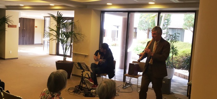 オープニングは、「The girl from I panema」から始まり、「Georgia on my mind」「Work Song」「The house of rising sun」などジャズを中心に、ご入居者様にも馴染みの深い曲を演奏していただき和やかなムード♪