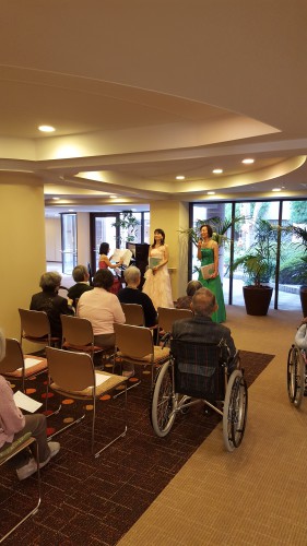2018.12.09 クリスマスコンサート 昨日 12/8(土)一足早く館内でクリスマスコンサートを開催しました。 今年はアンサンブル「ホッコリアス」のメンバーをお招きしてピアノ・ソプラノ演奏会 を開きました。 ドビュッシー作曲のアラベスクや「オー・ホリー・ナイト」や「もろびとこぞりて」など この時期にぴったりの選曲でご入居様の目にも耳にも楽しませていただきました。 途中に「ホワイトクリスマス」のピアノ演奏やアンコールでの「ウィーンわが夢の街」もあり、 あっという間の一時間で大盛況のうちに終演を迎えました。